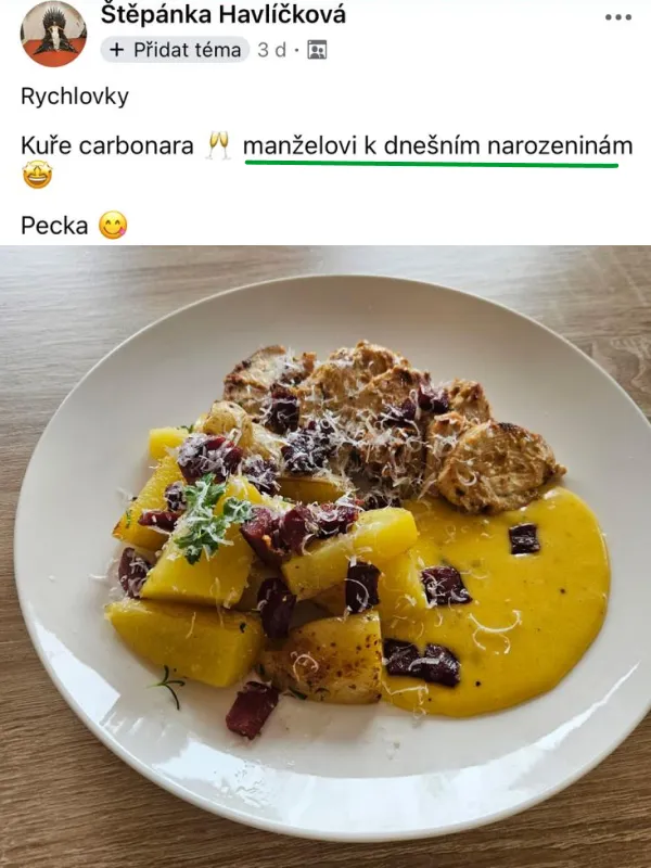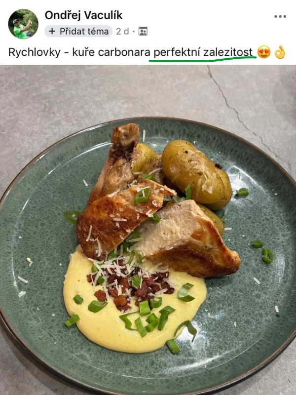 Originální recept, kterej nikde jinde neochutnáš. Kuřecí prso s krásně opečeným bramborem, zalitý omáčkou carbonara a zasypaný vypečeným guanciale. Buon appetito.